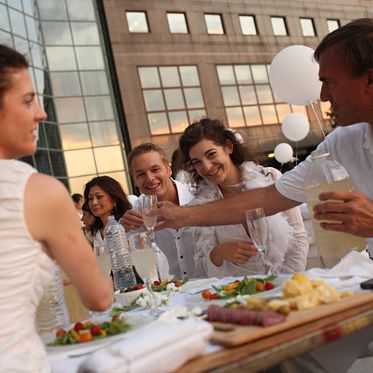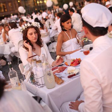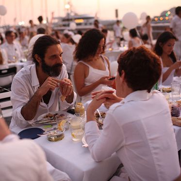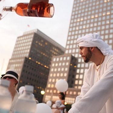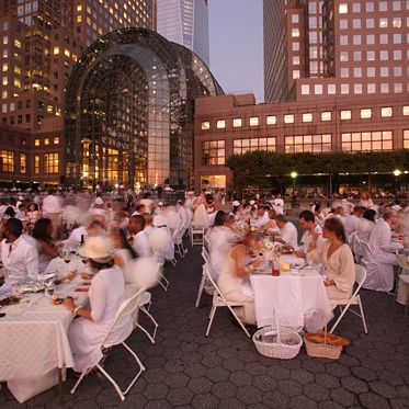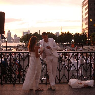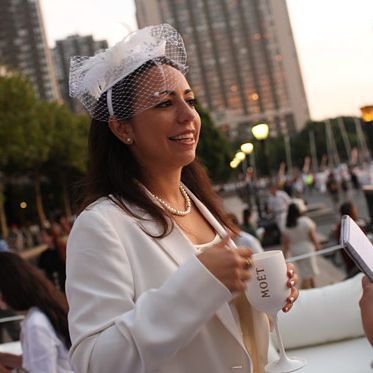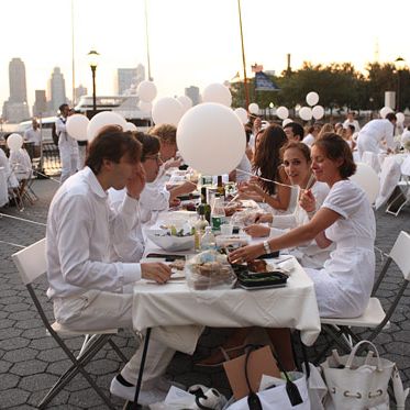 在烦恼了一天想着沾满泥巴的鞋子和需要买一个“白色、透明或棕褐色的伞,”晚上6点,格拉布街接到了Dîner en Blanc秘密地点的电话。当我们到达世界金融中心的“冬季花园”时,看到一排排铺着亚麻布的桌子、印有品牌的白色气球,以及1150名身穿消色服装的与会者,我们比想象中要高兴得多。这里的背景是漂浮的游艇。它实际上就像一个我们从未见过的纽约:朝气蓬勃,看上去很老式。我们敢说,更像法国人吗?