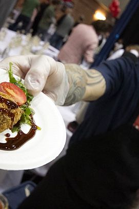 巧克力培根奶酪玉米饼,炖猪肚与米卡釉配tomatillo pico de gallo。