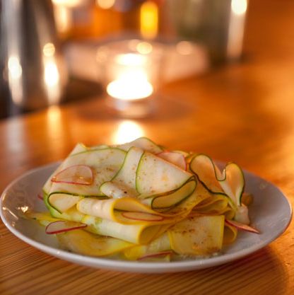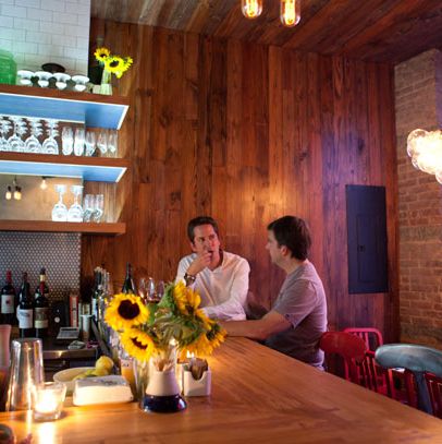If that description makes you roll your eyes and stifle a yawn, then you might be pleased to discover that Hamilton’s plates—whether they be small or large or midsize—are for the most part inventively composed, deftly assembled, and completely satisfying. The same can be said for the minuscule space, which combines stained wood, painted concrete, and subway tile to elegant (if sometimes noisy) effect. The bar stools are mismatched and metal, the light fixtures are bare bulbs, the tables are unclothed, and the napkins are paper, but fresh sunflower and hydrangea brighten the bar top, and bowls of tomatoes and peaches reside along the open-kitchen counter.