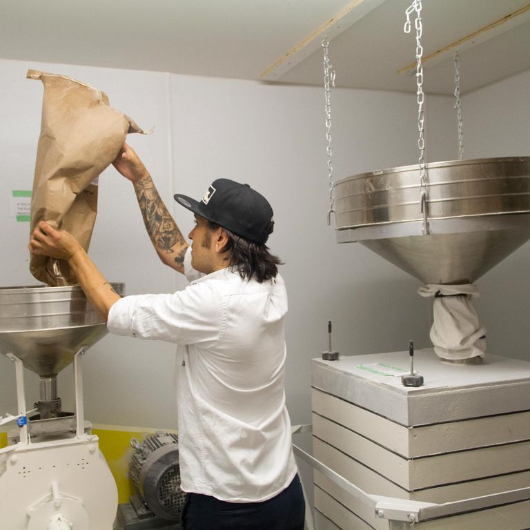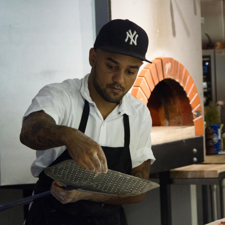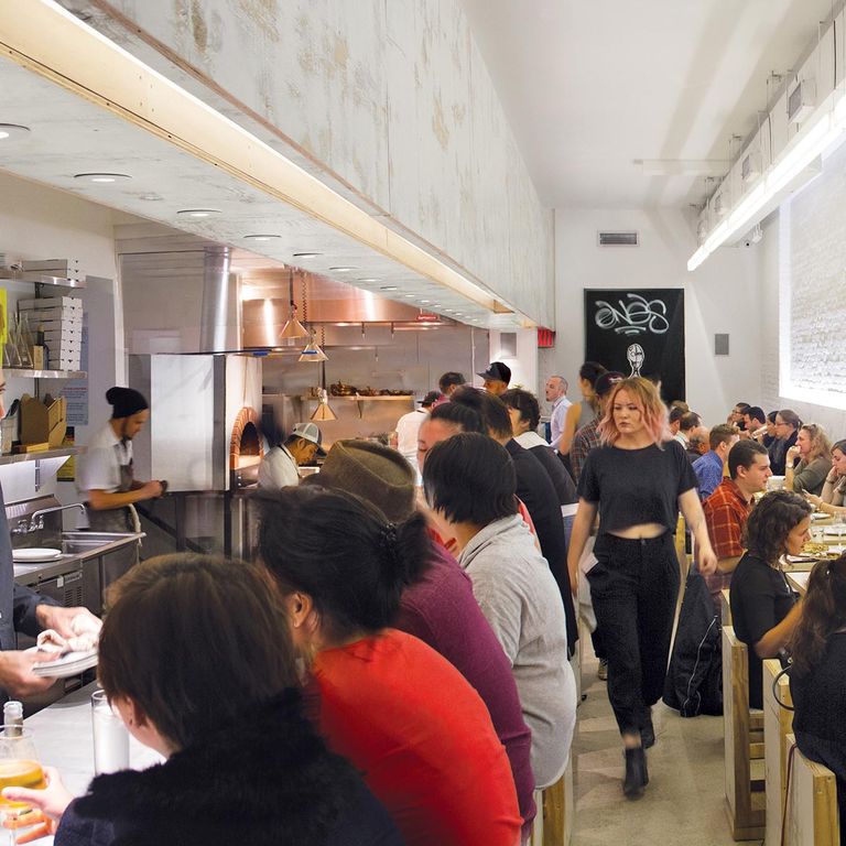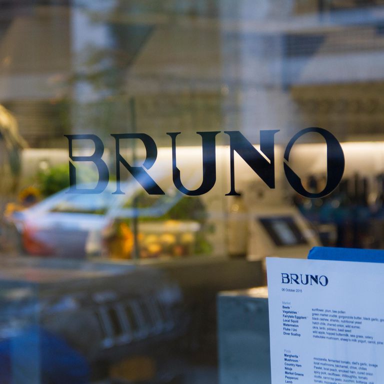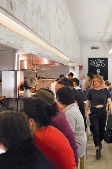 现在,在联合广场绿色市场东南方向的13街,布鲁诺(Bruno)餐厅开张了,轮到披萨了。布鲁诺餐厅是两位年轻厨师贾斯汀·斯洛科夫斯基和戴夫·古利诺的创意,确切地说,它既不是素食餐厅,也不是披萨店。备用的白色墙壁,长长的金属吧台,座椅似乎是用各种各样的桃色板条箱和木箱做成的,这个狭窄、灯光平平的铁路空间感觉就像你当地的CrossFit健身房最近安装的沙拉吧。当然,菜单上有肉(羊肉、扇贝、一些火腿丝),但馅饼的面粉是在内部辛苦研磨的,大多数蔬菜配料都是季节性的,菜单上的“市场”开胃菜区充斥着精致的绿色市场招牌菜,比如蛋白石罗勒、日本白雷萝卜和撒了“营养酵母”的童话茄子。