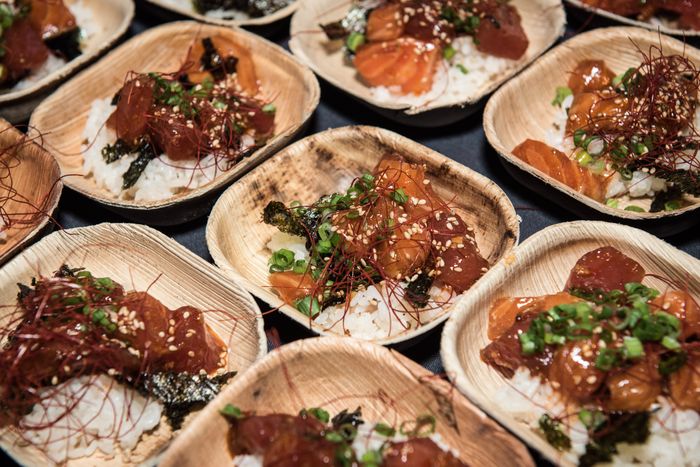 Momosan Ramen和Sake的金枪鱼和鲑鱼用crispy大蒜和noi对米