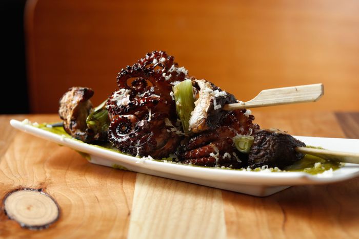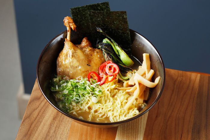 菜单分三大块:菜菜菜菜类八叉树和拉面喜欢肉类和蔬菜烤罐装鸡皮与牧场和路易斯安那辣酱混合匹配Baca从三叉拉面入手, 包括鸭肉配菜鸭腿加泡菜fresno辣椒和noi, hoyubroth加烤猪肩,