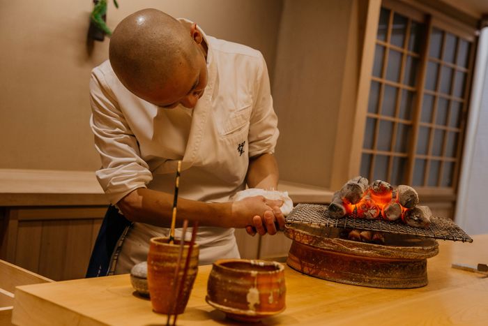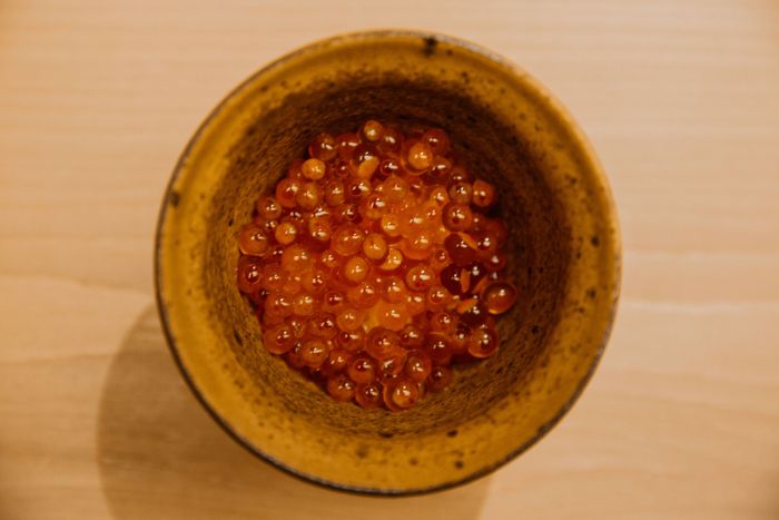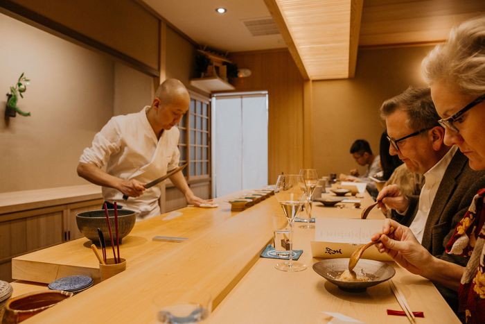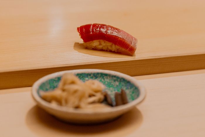 诺兹用剃头和苍白和和尚特征, 尽最大可能培养老式寿司算术的戏剧空气不足为奇的是,像edomae式老主人一样,他用各种传统技术来消老解老法,甚至储存在古型冰盒中,在熔化实冰板下晚饭时,我们品尝了几片银色的Sayori针鱼,加料和姜调味料,海热滑片在竹叶上熏染,和肥小扇贝,由主厨高手顶部穿孔像花瓣并逐片在吧台上服务除常用uni(北海道)和三文鱼叉子菜(清酒加米)外,还有四级金枪鱼,其中一级为厨师轮机,装有发色binchotan煤而不是常用丁烷火炬,作为鱼厨师,小屋充斥着甜街市场木烟和脂肪香味