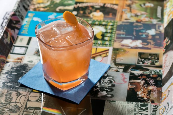 蓝丝带品牌的标志都在这里 高架DJ展台 跳楼 纽约州州立大学光学家画像Biggie和Debbie HarryCampari、Sweetvermouth和OrdOverholt等蓝字插曲、On6(tquila、rapefruit、ave和Greiro)和Notorious(gin、colle果汁、apple果汁、quafaba和Sangiovese浮动器)以相册命名,并计划未来直播音乐编程