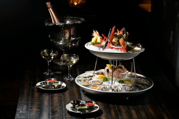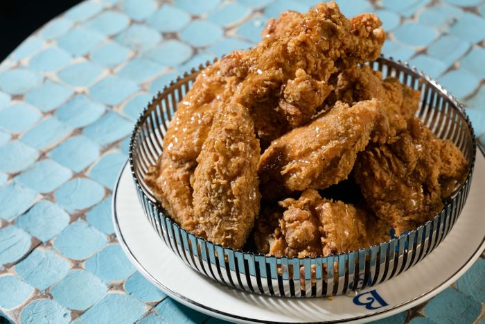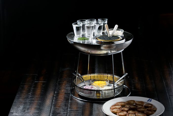 当然有炸鸡 带松露蜂蜜 和三大菜中之一 伴有cauliflowertura和回推ShrimpB-Louie蓝带海鲜运进塔子 鱼子酱拥有荣誉之地 服务于自己的窗幕间 回信回溯到兄弟们常在A&P买廉价罗曼霍夫鱼子酱并配上饼干 服务给父母 和兄弟 和来者 布鲁斯说"那才是我们真正花哨."