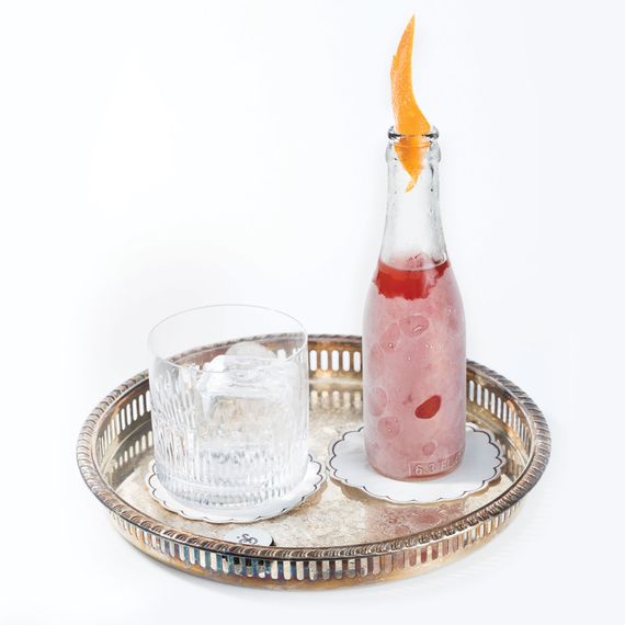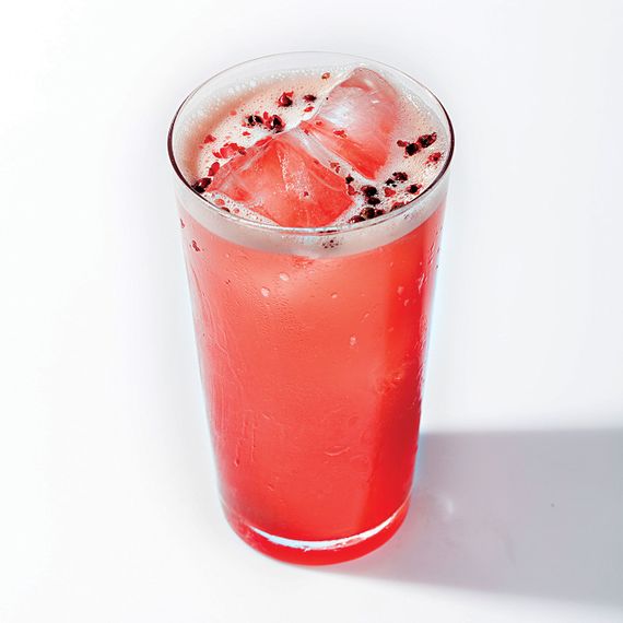 酒上Riff加插杜松子酒 和粉红色番茄调味料 加入葡萄园、tonic和Campari标准组合