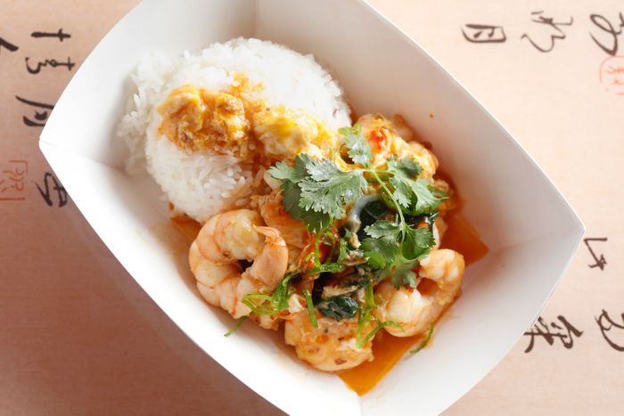 厨师在布鲁克林母院和唐人街祖母院长大新菜与他小心调试里夫斯和烹饪方法基本一致 烹调为熟悉菜带来了新菜张氏从上海遗产取点提示 可见上海虾菜受虾龙虾酱启发 由螃蟹鸡蛋 干扇贝制作