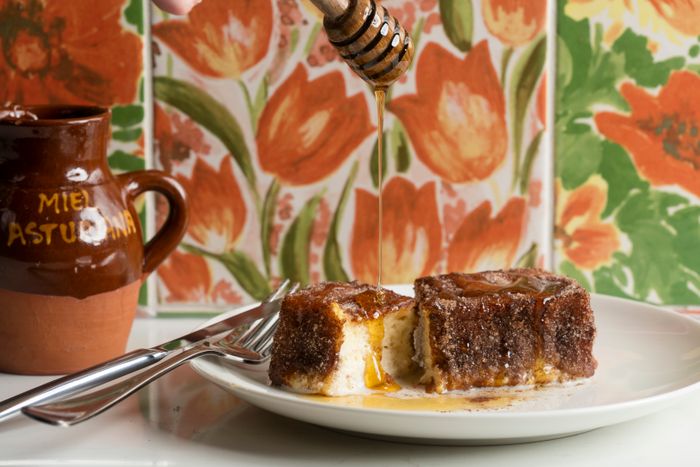 和纽约最老派西班牙餐厅一样 Flan为甜点服务取新式老菜皮加马 1951年在巴塞罗那餐厅发明7波尔特或菜单通知我们经典costard和eqe Melba拼凑出并受美国海军军官请求启发, 并令人愉快地证明 Andrés西班牙餐厅只是西班牙、纽约和餐厅 长线跨文化传统中最新一行
