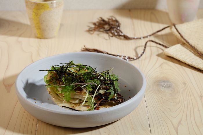 一种烤口味凯撒, 和crispy anchovy和煎洋葱 crack, 大蒜米索酱, 和mizuna和noi装饰