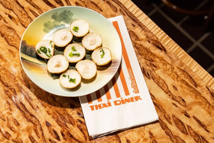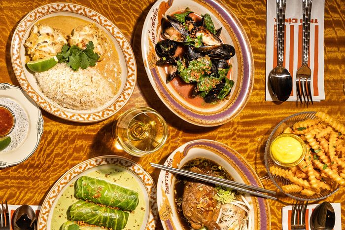 Thai Diner菜单提供非道歉混合食品:一些经典美式菜,一些直达泰式菜,以及其他混合两种菜盘。65位空间设计由列丁和她妹妹梅并受中世纪链路Schrafts格鲁布街询问主厨 是否愿意带我们通过菜单 并解释填充卷心菜最后如何加绿色咖哩酱