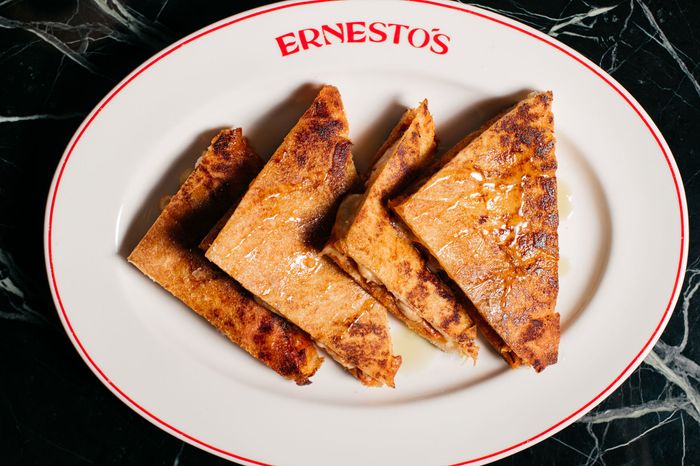 大表填满这个balmyalfresco晚宴, 和晚饭时街灯开亮, 照亮人行道和公园对面软光存储在地下室的三顶帐篷搭建时雨或冷,服务器表示,当冬天到来时会加热在那之前,酒单上有很多果汁鸡尾酒来取暖(试金调5指马提尼),并有一系列优雅、树枝加点甜点,如全梨子浸入酒中配有牛奶勺子和烤杏仁和丰盛的经典生菜轮接送时用勺子令juders愉快我高兴地报告 仍然有匹配书设置碗 入口COVID-era Ernesto's2.0