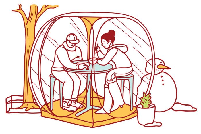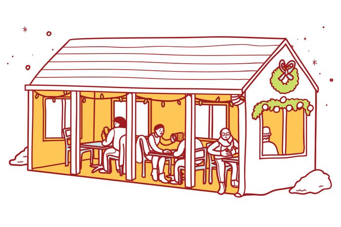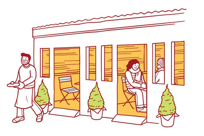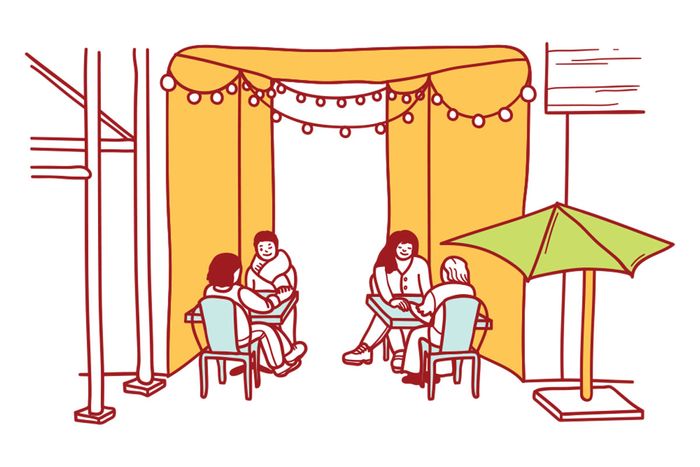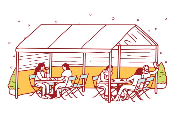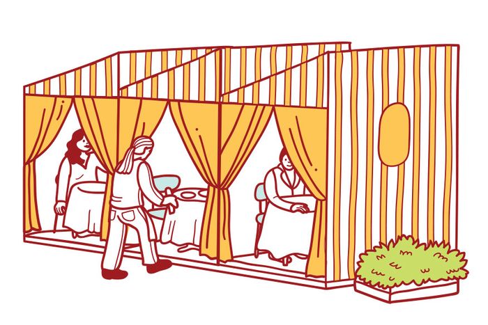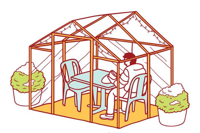大流行室外餐厅早期,纽约人幸运地找到了伞的遮蔽和掩蔽城内街道进化成自己的建筑元件 松散分类素材 大小和形状环游街段可能会显示结构 如此奇特米安多型设计 需要田间指南保持直通