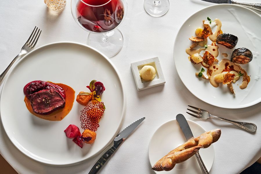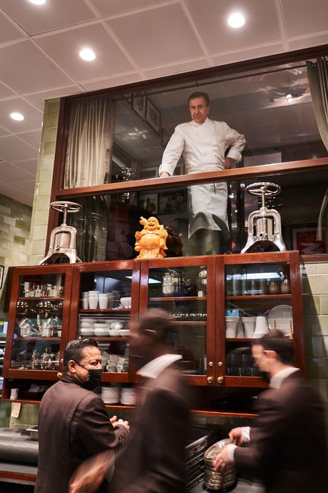从Skellbox窗口向下厨房开放嵌入闪亮引擎盖的是米开林指南中两个红红牌,表示餐厅在2020年和2021年赢得2星三星连连连连连连连连连连连连连连连连连连连Boulud全组织-Dinex集团-都视之为灾难事件