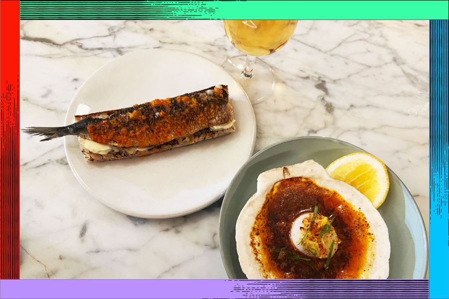任何人酒牌都可以把pet-nat和Palomino上菜单,但有一些细节本该通知我,也许这个新酒吧不像其他所有酒吧有一件事 即使是周一暴风雨 屋子里满是高手艺术类型 晚上7点我唯一空位换句话说,我没有看到任何人没有某种食物, 说明厨房放出比橄榄、坚果和charcterie标准三维多的东西