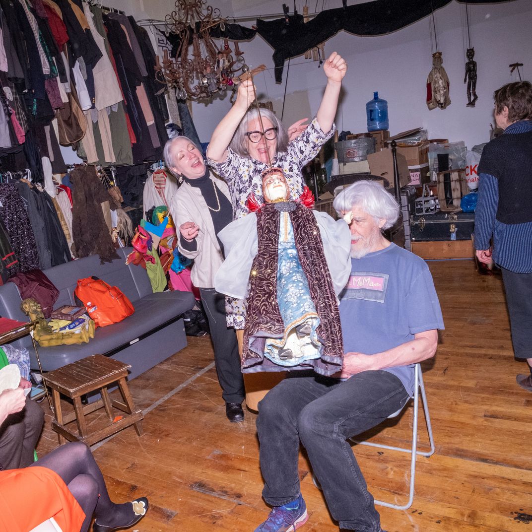 一周后,CAMT在一个拥挤的Dumbo仓库里执行晚宴期间实践的节目各种大小木偶从时代过去和现在悬浮从木筏待命,我们注意到Katarina的丈夫和四个孩子正在参赛。光线暗淡时Hoejš与其余团一起插进房间并开始表演十八宫舞蹈 唱 喝 推送 上台送死他们的脚从不离开地面,人们提醒我们 Katarina在晚饭上告诉我们的事情:“我吸入木偶,它告诉我该怎么做。”