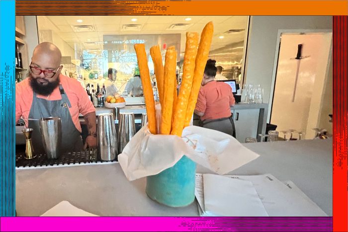 由厨房员工制作 双尺热切托斯斯梅市高档餐厅 轮值艺术收藏邻接酒吧,我坐的地方, 下注值要低得多, 虽然食物仍然服务 餐厅口令陶器服务器常告诉我盘子概念化与食物并发, 我会说,我简单理解主厨说芝加哥被忽略为国家餐厅目的地, 因为如果纽约餐厅翻转XL奶酪泡泡并置入本地制作的天空蓝云中,