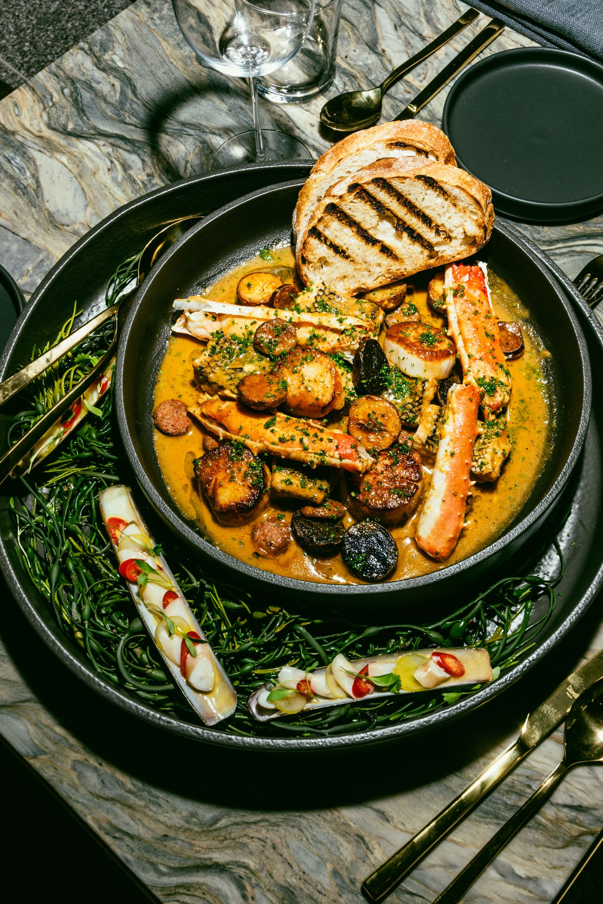 这种努力的一部分包括提供在各自社区受欢迎的菜肴,但并不完全受到烹饪机构的支持。例如,Onwuachi在加勒比海地区找了一道开胃菜:牙买加社区(以及更大的西印度群岛和黑人社区)长期以来的主食馅饼,在这里用咖喱山羊馅,这是这个岛国的另一种最爱。还有牙买加的埃斯科威奇鱼(escovitch)及其辛辣的蔬菜挞,以及塔蒂亚纳(Tatiana)用调味浓郁的鲷鱼制作的褐色炖鱼。索弗里托烤鸡和牛尾配米饭和豌豆是加勒比地区的最后一道菜肴,然后才是南方腹地。克里奥尔鲑鱼(由帝王蟹、秋葵酱和烤秋葵制成)讲述了该地区丰富的海鲜及其与非洲的联系,而一种名为“杜克妈妈的虾”的虾则让人想起了他自己母亲的克里奥尔烹饪。“在我们长大的过程中,她会让我们用克里奥尔香料黄油、大蒜和百里香剥虾吃,”Onwuachi回忆道。