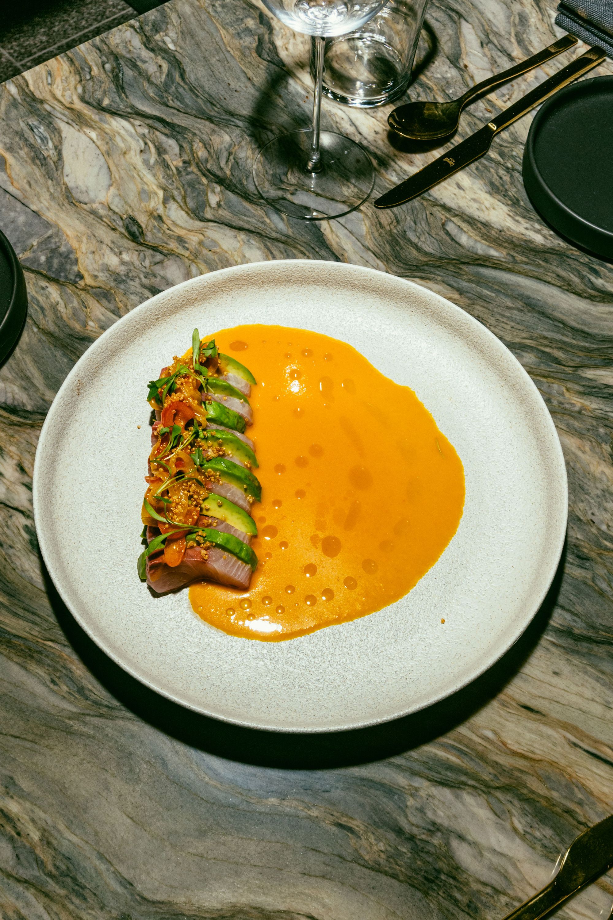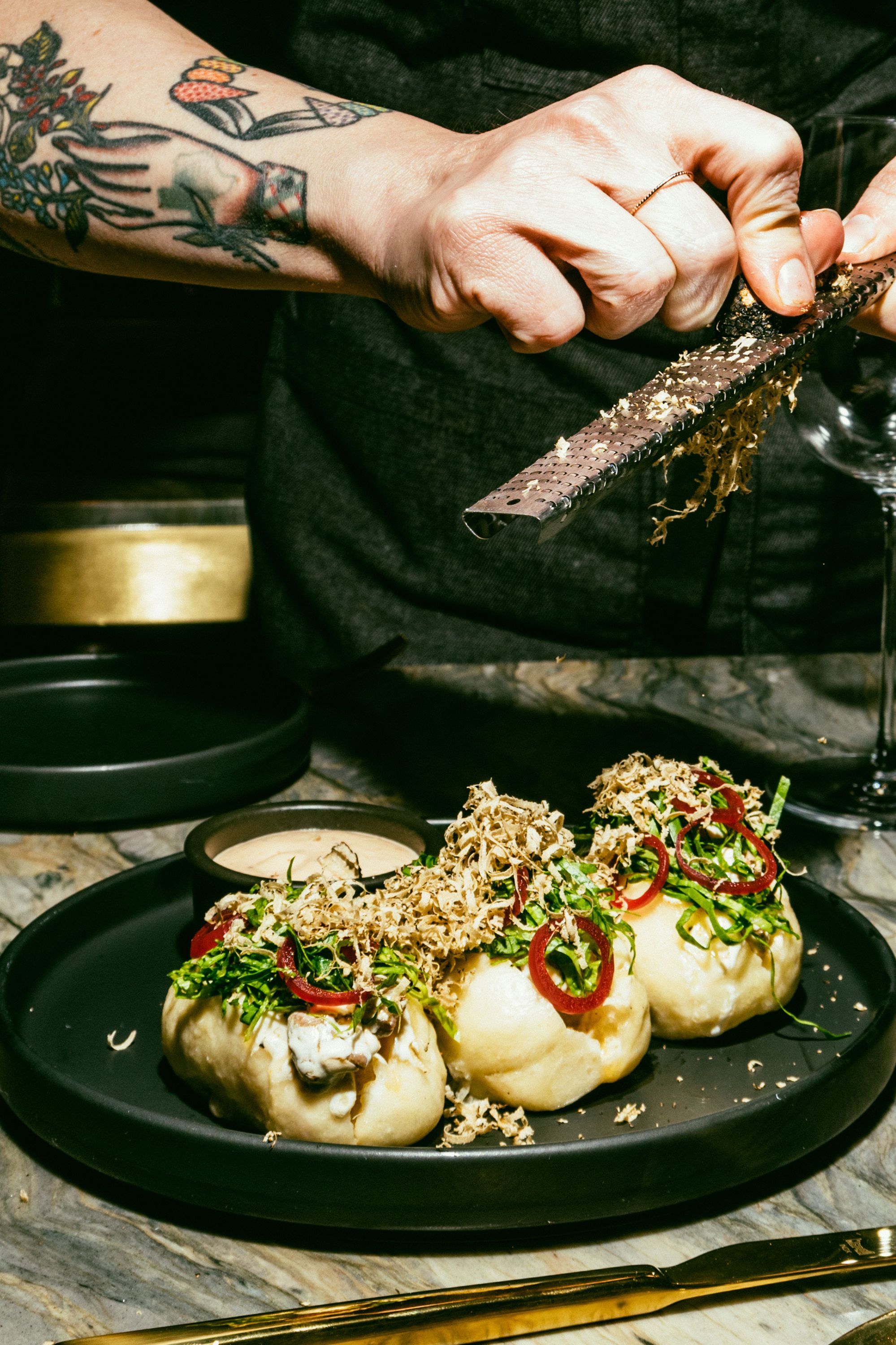 Tatiana的菜单也向纽约致敬——比如外卖蘑菇(外卖蘑菇是一种配葱煎饼的北京蘑菇),而dsamcor则特别提到了当地,比如像湿消防栓一样的彩虹柱。Onwuachi说,悬挂着金链子的格子让他想起了小时候“跳过铁丝网的情景”。