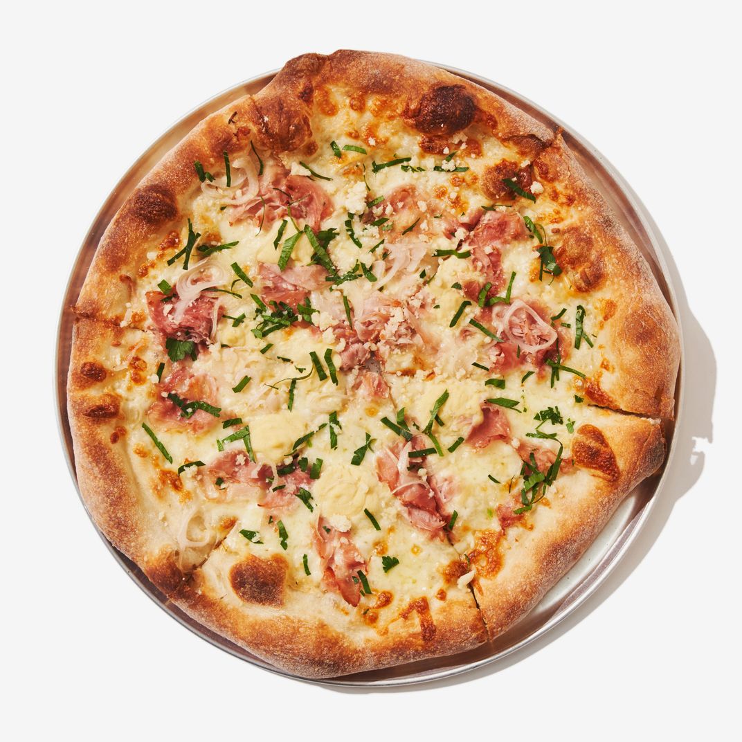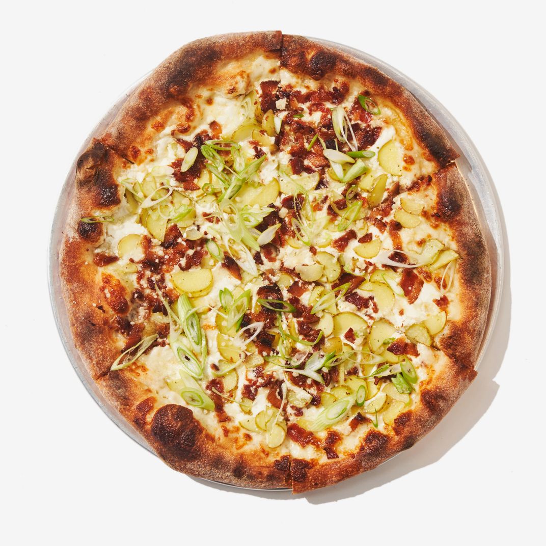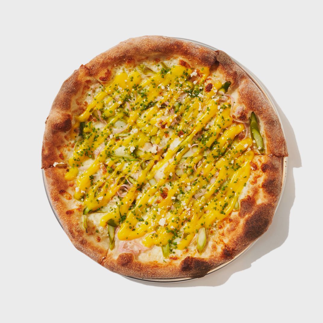 对于经典派来说,面团被小心地拉伸(而不是搅拌),并淋上从挤压瓶中取出的番茄酱。这种奶酪是低水分的mozz和一点新鲜凝乳的混合物,足以在不增加水分的情况下获得一些牛奶味。浇头也很接近传统的变化。除了普通奶酪,还有意大利辣香肠。Yolks on You混合了芦笋和少量蛋酱,让人想起Dufresne在wd~50时提供的蛋黄圆柱体;农夫的特色是烟熏奶酪、火腿和山葵。它尝起来就像一个特级塔特flambée,它可以用一品脱黑啤酒在旁边。这种搭配同样适用于Stretch 's Old Town派,它把明斯特和sautéed蘑菇和粗面包屑铺在一起,这些食材是从附近的杜弗雷纳喜欢的一种烤奶酪中挑选出来的老城酒吧.芝士有一点放克的味道,面包屑有令人愉快的大蒜味,但最令人惊讶的是,这一切似乎都很容易辨认。