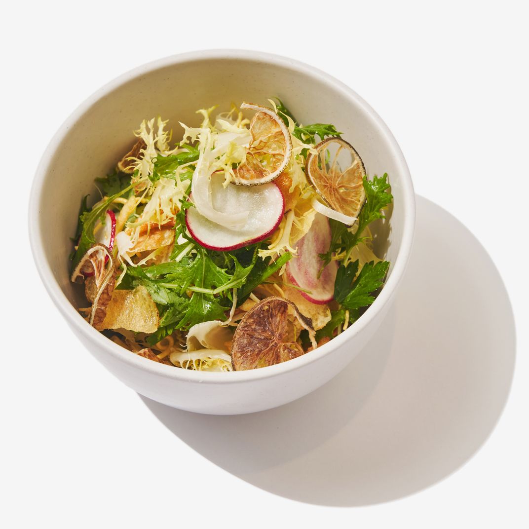 下周,3月17日,Dufresne(与面包老板Gadi Peleg一起)将把这家快闪店变成永久的披萨店在公园大道南区,这位厨师对修补的承诺仍然完好无损——人们能感觉到他永远不会停止调整面团配方——即使他对狂野口味的拥抱已经软化了。(别指望这里会有充气鹅肝。)除了碳酸内格罗尼和冰淇淋加上热蜂蜜制成的mr . softee风格的“外壳”,杜弗雷斯最知名的项目可能是“薯片沙拉”,其中草药、绿色蔬菜和橄榄油与绿色市场的薯片混合在一起,撒上自制的醋粉,重现了传统油醋汁的效果,同时确保一切都保持松脆。