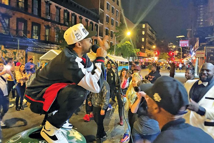 后方派对从转角开始, 站到垃圾桶顶端, 说唱者IsBizkit嘴语合成街灯照亮烟雾仿佛提示上,可转换宝马拉满 参加庆典的年轻美人街对面 警官站在车旁 留意现场